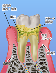 歯肉炎から進行すると、プラークや歯石がどんどん増え、歯肉の腫れが強くなります。歯と歯ぐきのつなぎ目部分が破壊され、歯周ポケットが深くなります。歯周病菌は次第に歯を支えている歯槽骨まで進行し、骨を破壊してしまうのです。